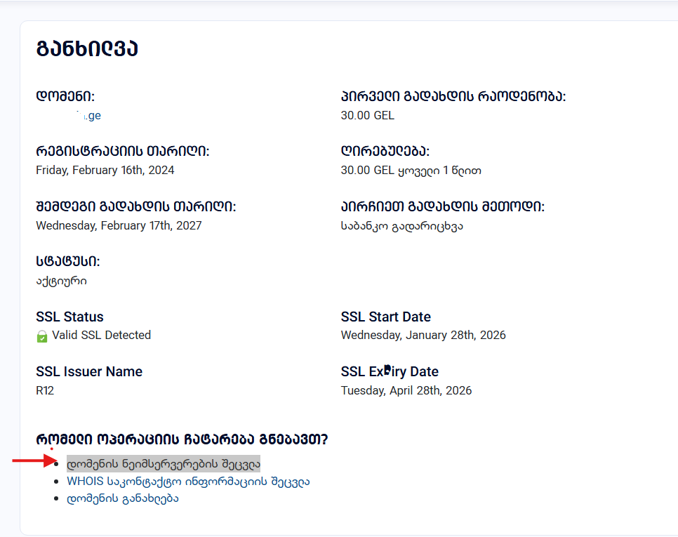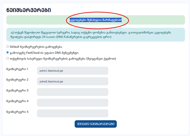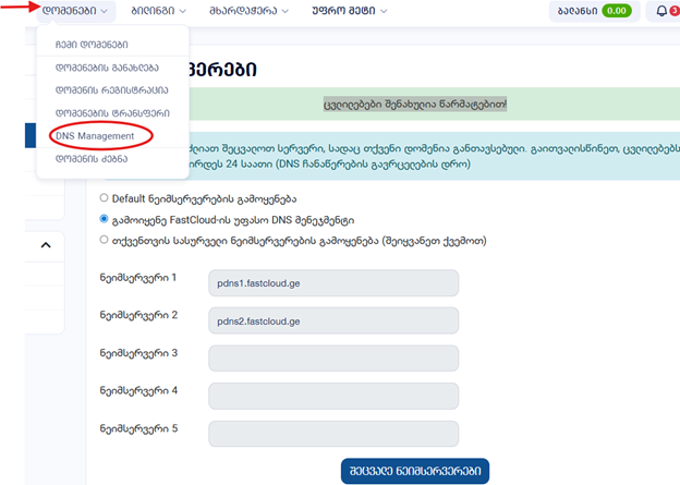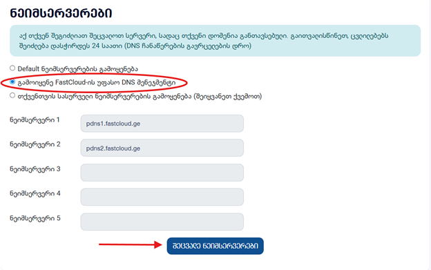 ახალი დარეგისტრირებული ან დატრანსფერებული დომენების შემთხვევაში რომ გამოიყენოთ უფასო DNS მენეჯმენტის სისტემა, უნდა შეცვალოთ დომენის ნეიმსერვერები. ნეიმსერვერების შესაცვლელად მიყევით ქვემოთმოცემულ მანუალს: