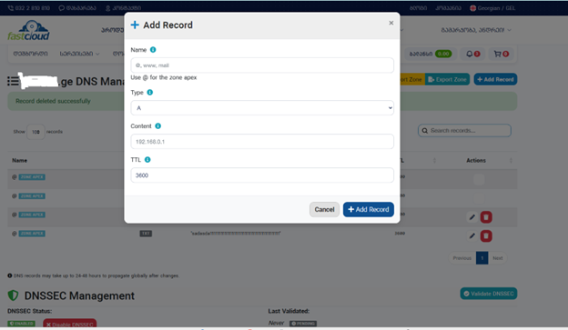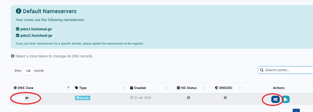 დომენის რეგისტრაციის ან ტრანსფერის შემთხვევაში უფასო DNS მენეჯმენტის ფლაგინი ავტომატურად ქმნის დომენის შესაბამის ზონას DNS სერვერებზე: